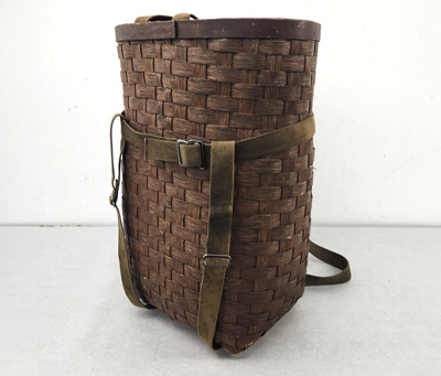 BASKET BACKPACK-N.D., WOOD, CANVAS, METAL, BROWN, 17.25″ X 12.5″ X 25″, OPEN TOP, OVAL SHAPPED OPENING, SMALL CARRY HANDLES ON TOP, STRSP AROUND PERIMETERM ADJUSTABLE SHOULDER STRAPS, SLATS ON BOTTOM, PERIOD